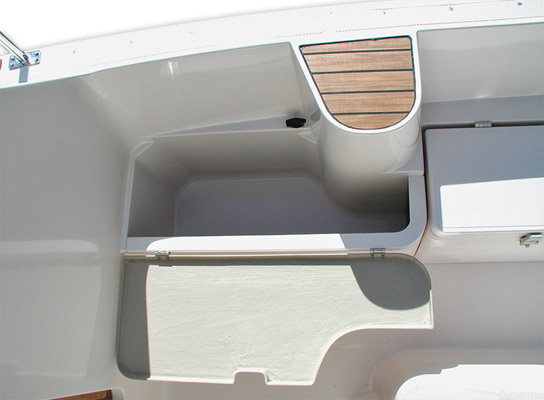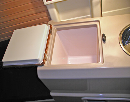 コントロールパネルの前にはコンパクトなギャレーカウンターを配置。深さ十分のシリンダーシンクと電動フォーセット、そして保冷力抜群のアイスボックスが標準です。オプションで12V電気冷蔵庫(本格コンプレッサータイプ)に発展も可能です。