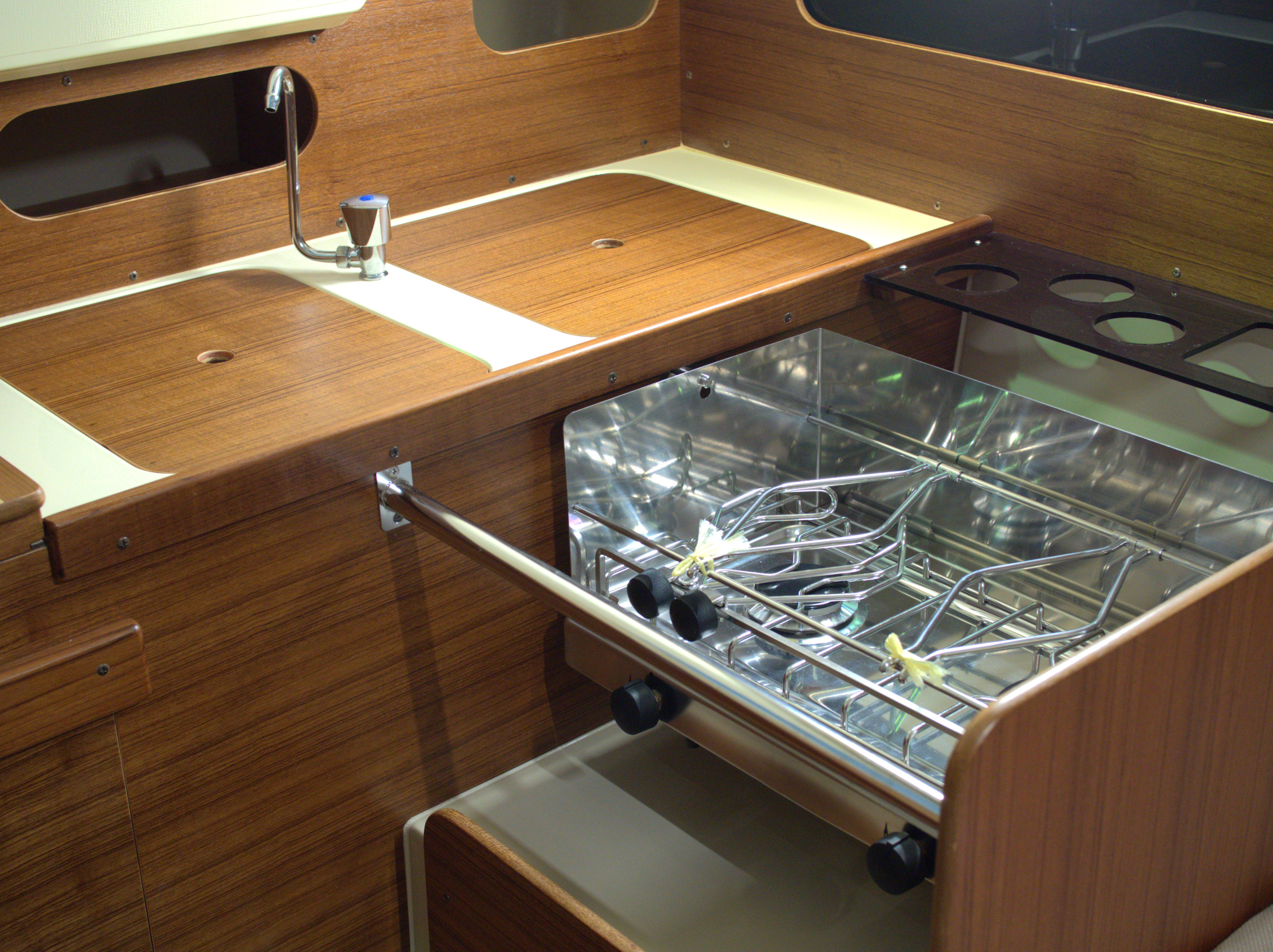 ■シンク、アイスボックス、コンロ、食器・食品棚。必要十分な装備のギャレーはコンパクトに使いやすくまとめられています。