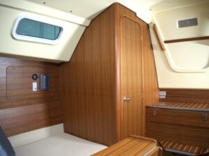 ■チーク板で囲まれたトイレルーム回り。メインキャビンの広さも雰囲気も損ないません。