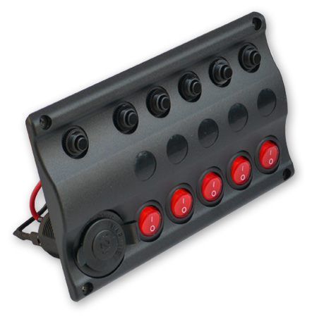 | 特徴 | ●縦にも横にも使えるおとなしめのウェーブデザイン。 ●高耐紫外線性のABS製で水に強い防水性(IP65)。 ●ブレーカータイプのため、リセットボタンを押せば復旧します。また、写真のように別売の「防水キャップ(7/16ネジ)」でカバーすることもできます。 ●ラベルステッカー30種付属。 ※裏面配線のマイナスバーはLED点灯用のものです。 |